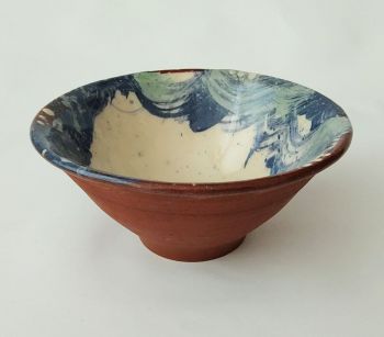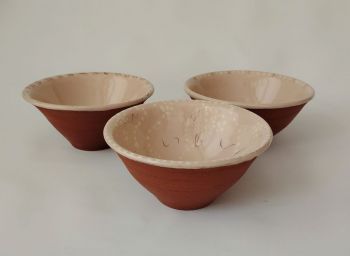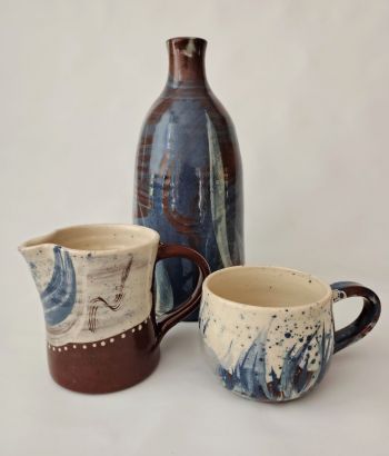 I have a strong sense of belonging to Cornwall, particularly Lostwithiel. Slipware is a local expressive art, it celebrates life and the turn of the rural year. Two seemingly simple materials direct my making, warm hued terracotta and luscious creamy slip. Usually wheel thrown and electric fired, the red earthenware pots are layered with opaque or partly transparent liquid clays and scored with marks inspired by trees, hedgerows, the river and the sky.