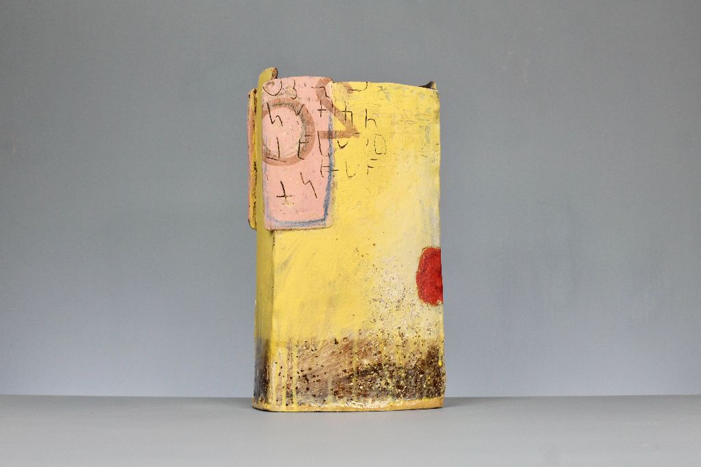 I intend my slab built vessel forms to be enjoyed as 3 -dimensional paintings. The construction of these vessels is informed by a patchwork collage technique that I practice in my sketchbooks. Once constructed, further marks are added using a mixed media approach to ceramic materials. The broad extent of materials I use allows me to create a diverse range of marks, textures and colours, but just as important as the materials used are the varied, diverse and experimental techniques that I use to apply them.