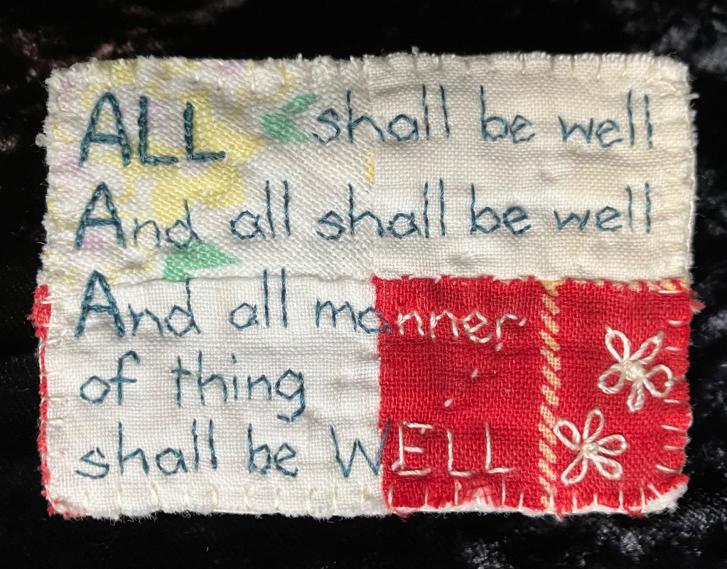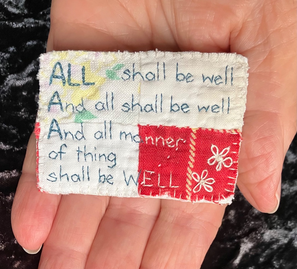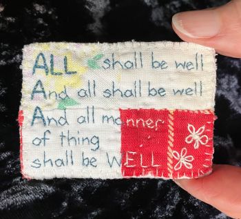 Aiming to have an entirely sustainable practice, I work with preloved and used materials, hand sewing vintage fabrics, papers and found objects into stitched collages and other work with a strong narrative, often adding text, including my own poetry to tell stories in stitch.