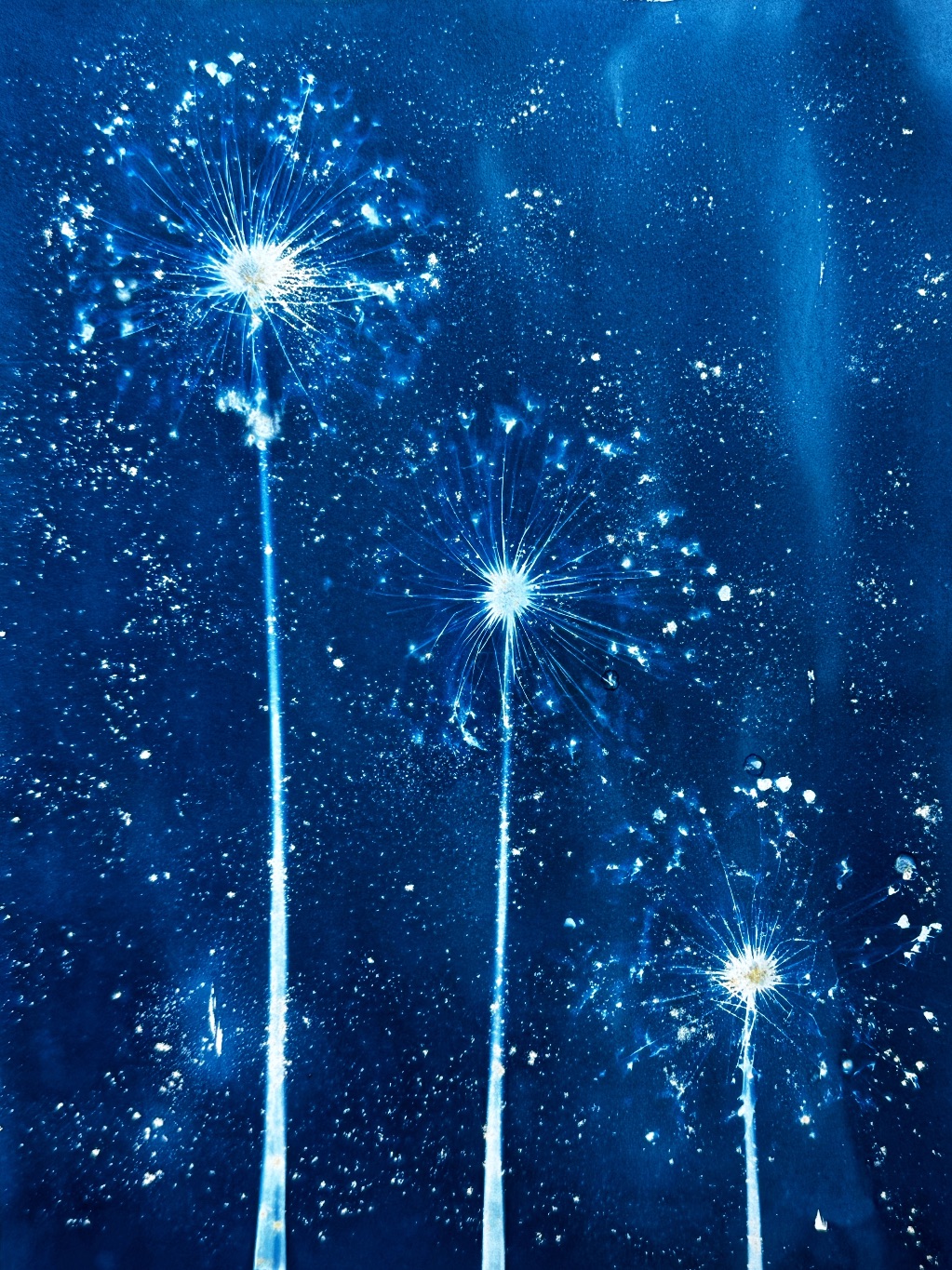 The cyanotype process was invented in the 1840s before the camera was invented. The chemicals are painted onto watercolour paper or fabric. If for example a leaf is placed on top and it is left in the sun, the leaf stays white and the rest goes blue. This is the origin of the word 'blueprint'.