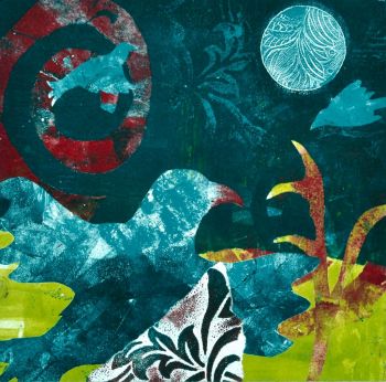 I love printmaking! I love the magic of it. On the press in my studio at Krowji I create monoprints (meaning they are one-offs) using a mix of techniques: drypoint, collagraph, printing with found materials, stencils and stamps, etc.