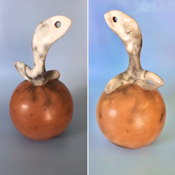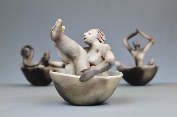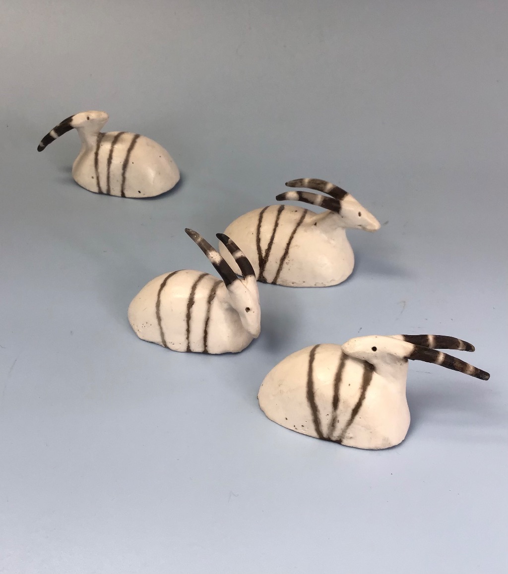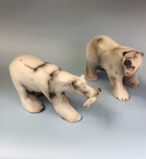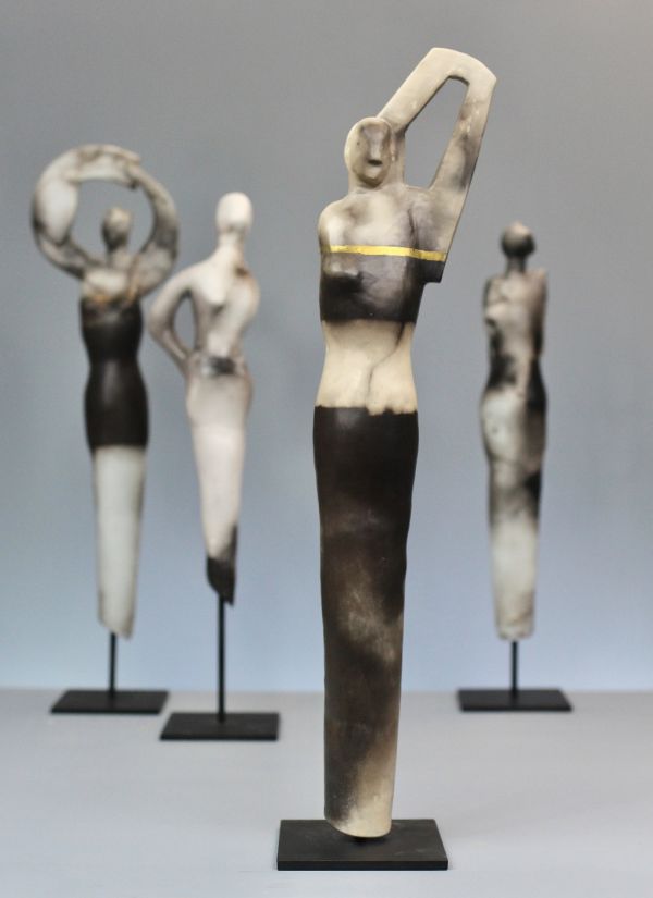I make figures and animals, based on fashion, movement and expression.The work is made with a variety of hand building techniques, slab built, pinched and coiled, and then smoke fired in sawdust outside after the surface has been applied with a variety of resist techniques.