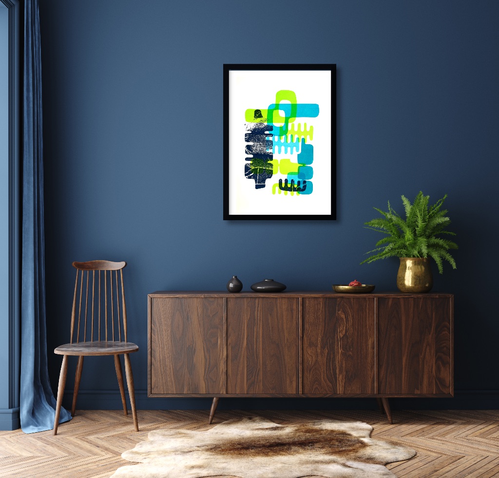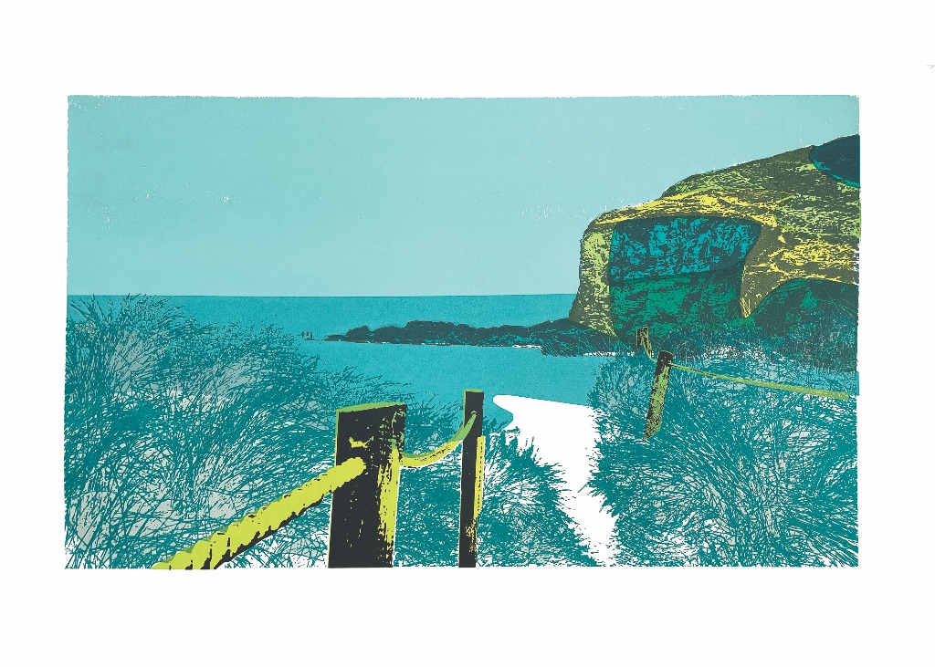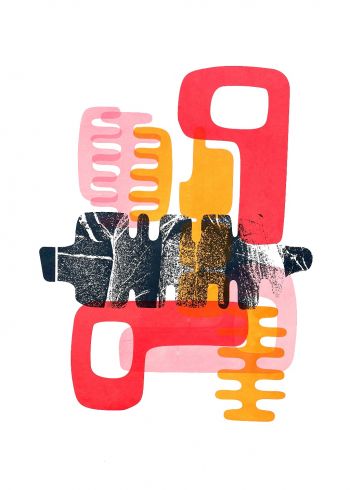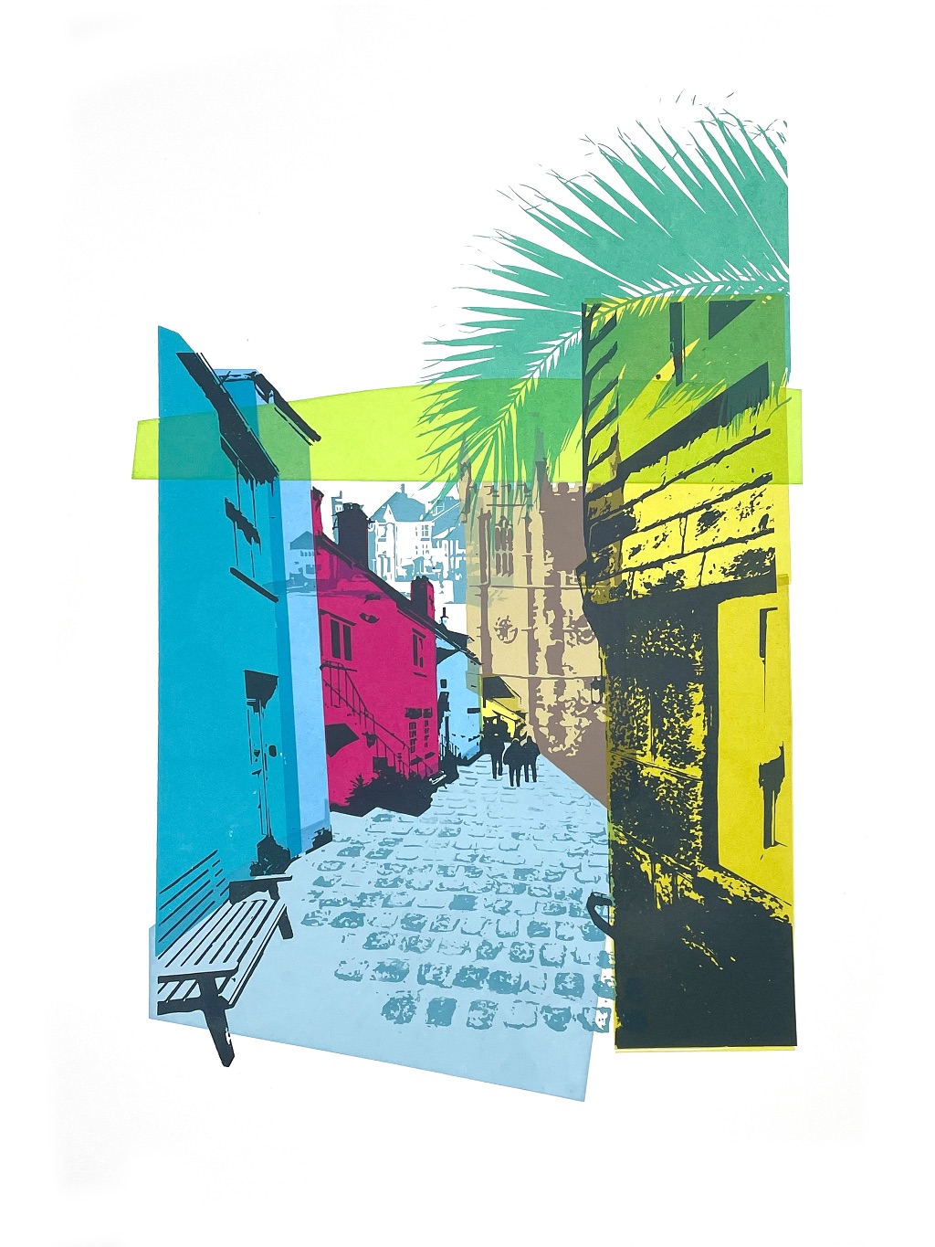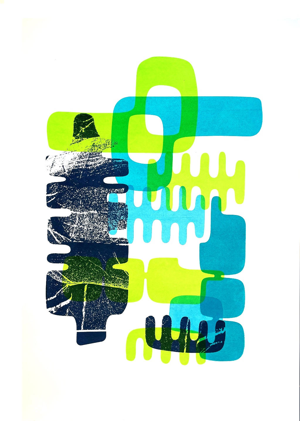 My screen prints are bold and colourful. They range from descriptive, often of local landmarks to abstract shapes and textures inspired by my environment.