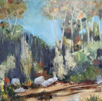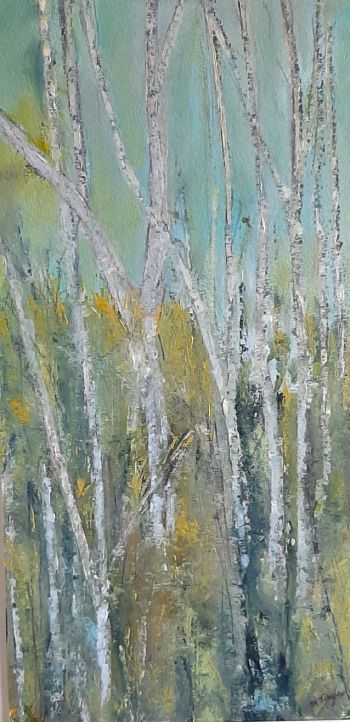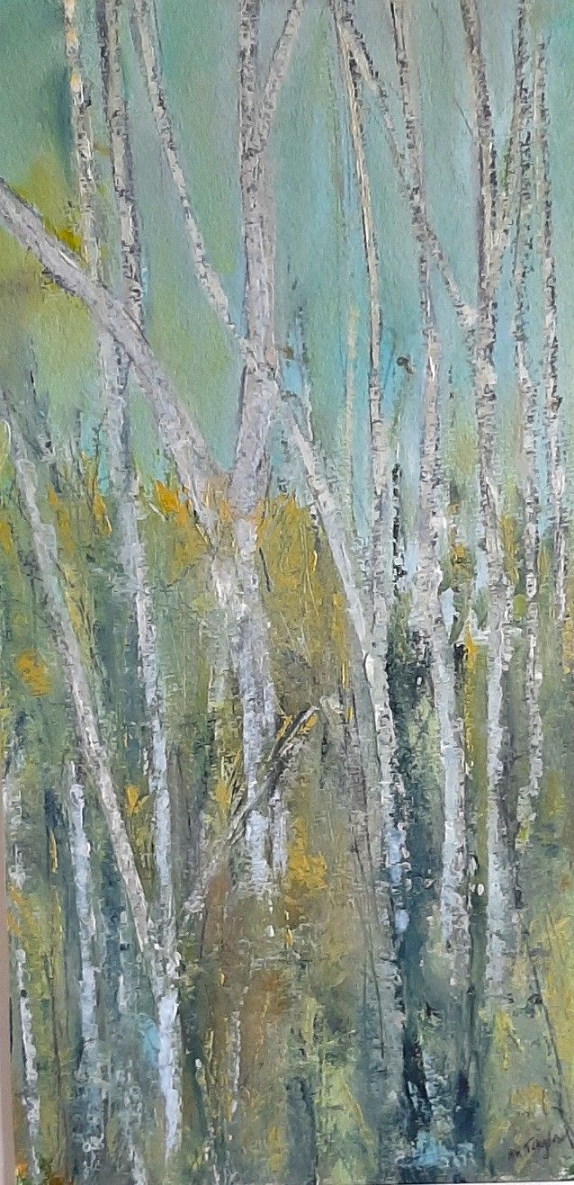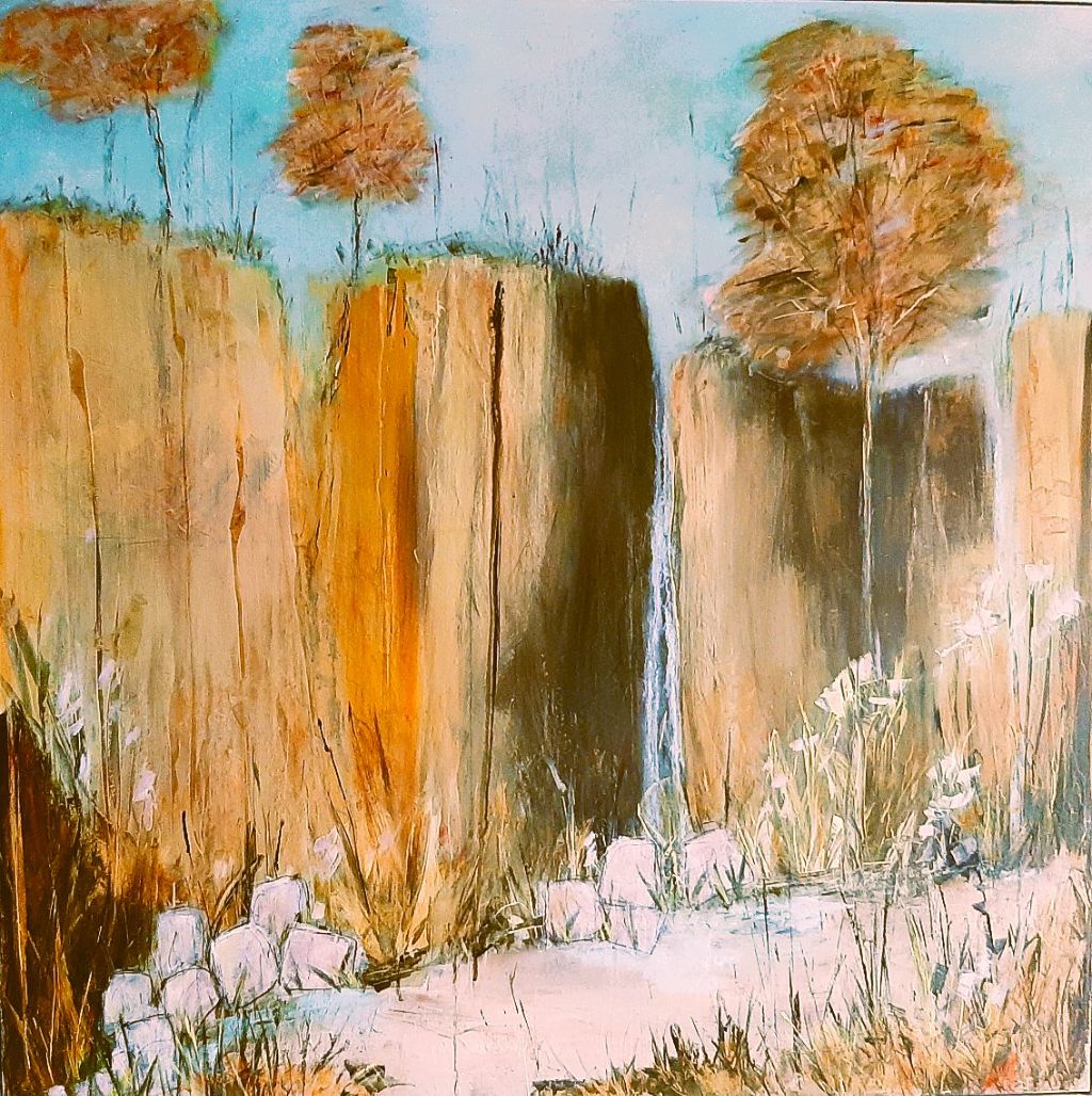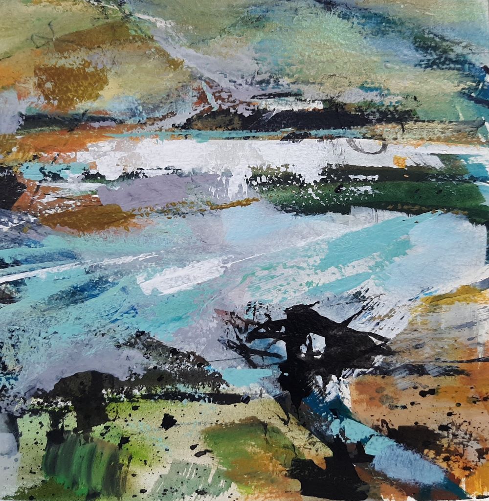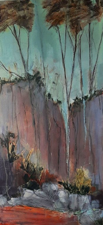 Intangibles of intense mood, energy and atmosphere. Influenced by a background in exhibition design, I am interested in the structure of the landscape, considering both past and present. From observation while in the landscape, from sketches, memory and the feel of the ambiece of a selected place, a piece of work develops with mark making, acrylic and mixed media. I take elements of the landscape, exploring the literal quality and by deconstructing and reassembling, but still preserving the spirit of the location.