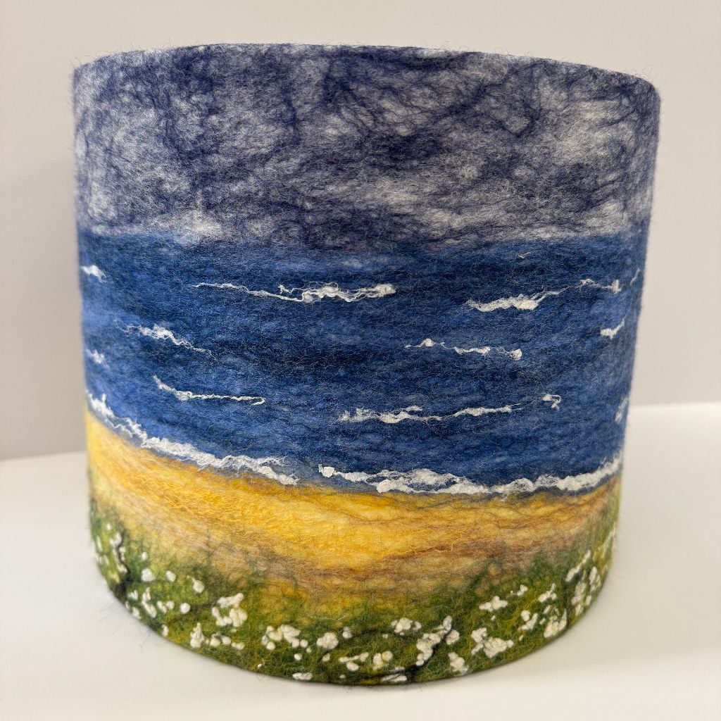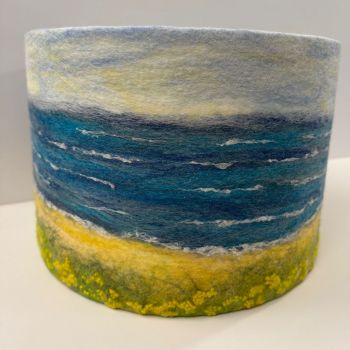 I have been Felting in Cornwall for six years. I enjoy creating my own colour mixes from a range of natural fibres, mainly Merino and Shetland wools with other fibres such as silk. I produce a range of colourful, unique, durable and decorative gifts. Products range from scarves, felted seascape & landscape pictures, lampshades, glasses cases, vases, bowls, bags and felting starter kits. I have greeting cards produced from my original work and felting kits.
