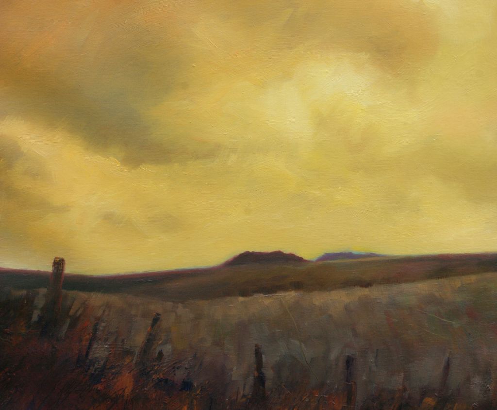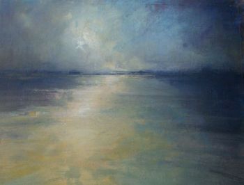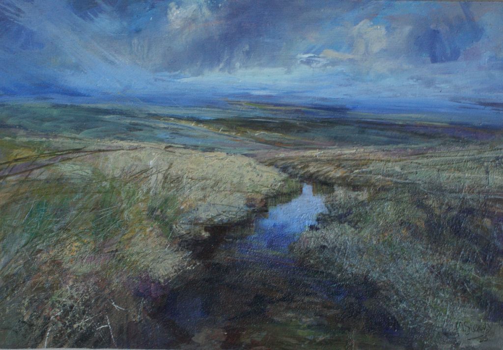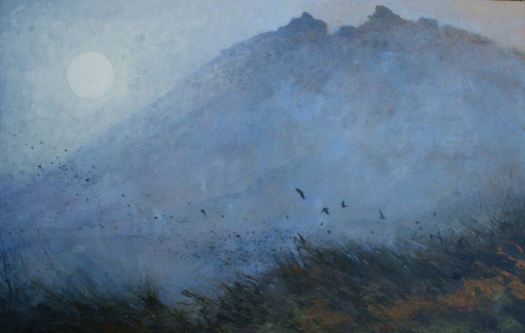 His paintings are inspired by big skies and liminal places – moorland fringes, sacred landscapes, hidden lanes and wilderness – watery, rocky, deserted and ethereal.