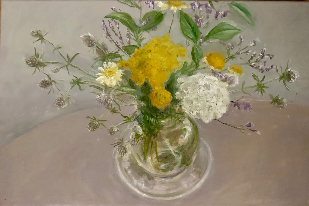 Her paintings are mainly still lives and landscapes with occasional forays into abstraction to stimulate her imagination and practice.