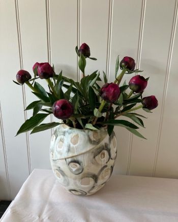 I work primarily with stoneware clay and, while all of my larger pieces are handbuilt, I'm continually challenging myself to improve my throwing skills!