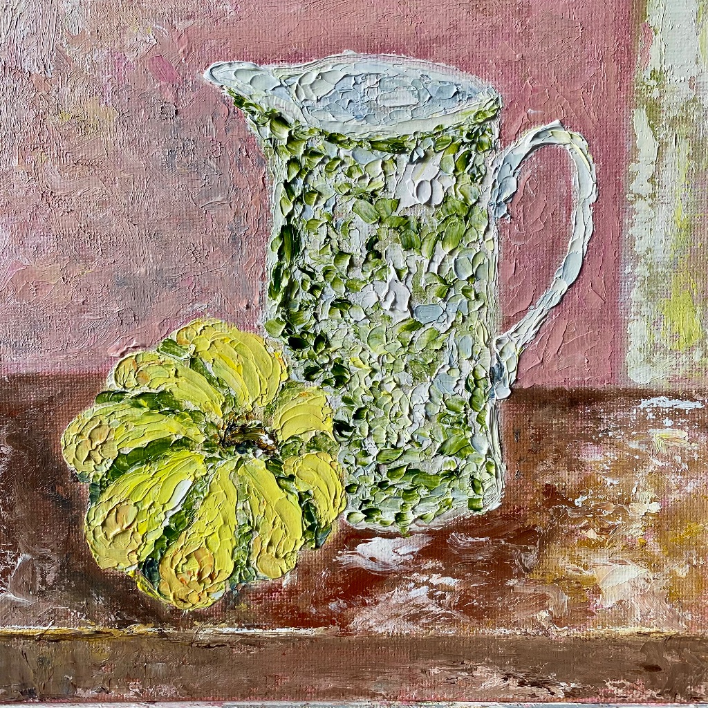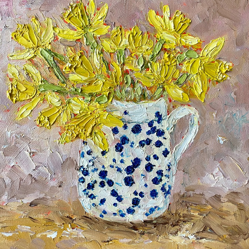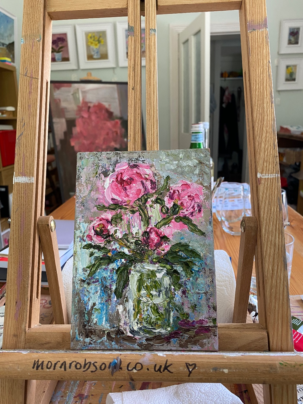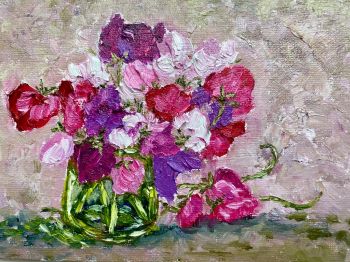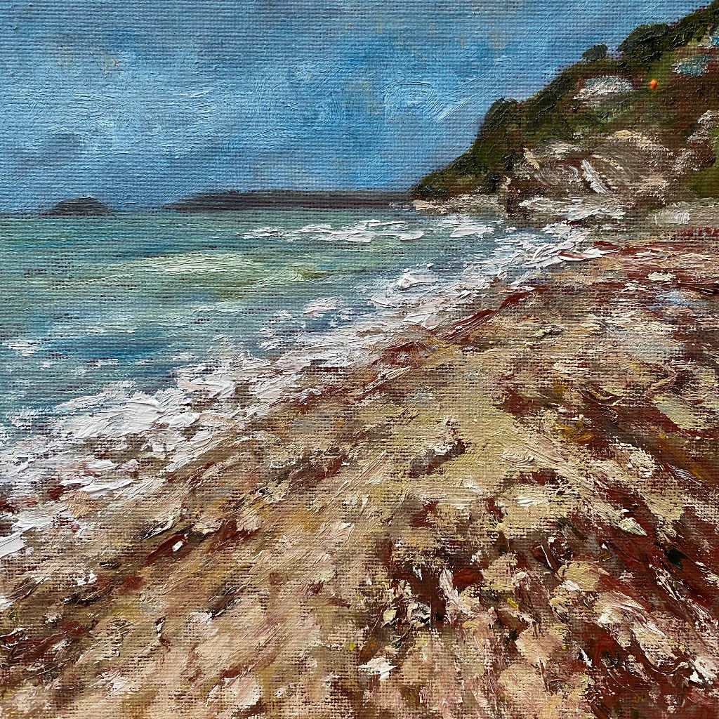 I have recently moved back to my beloved Cornwall, following spells of living in London and North Yorkshire. I am delighted to be living near the beautiful coast which has always been a source of great inspiration for me, and I find the gentle energy of southern Cornwall really speaks to my style of painting. I love to paint the sea, but also find great joy in flowers, fruit and interior scenes. I work quickly and intuitively, usually with oil paint which is often applied with a palette knife to create a dynamic effect. While the subject may vary, a focus on texture, light and vibrancy is a common theme across all my work.