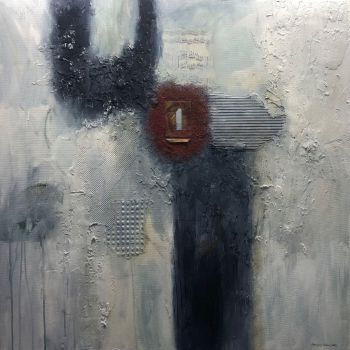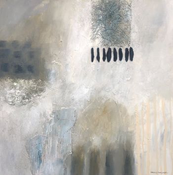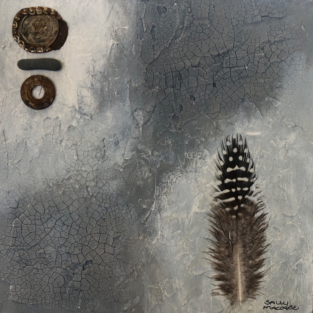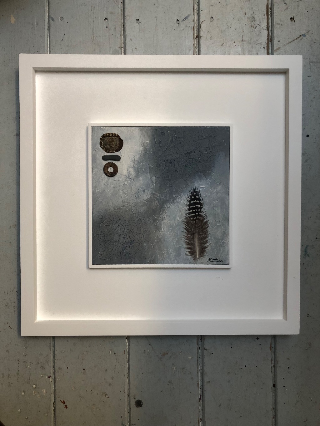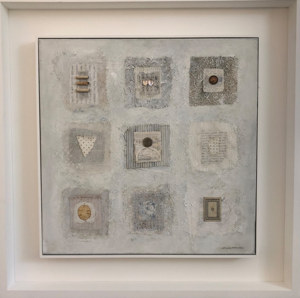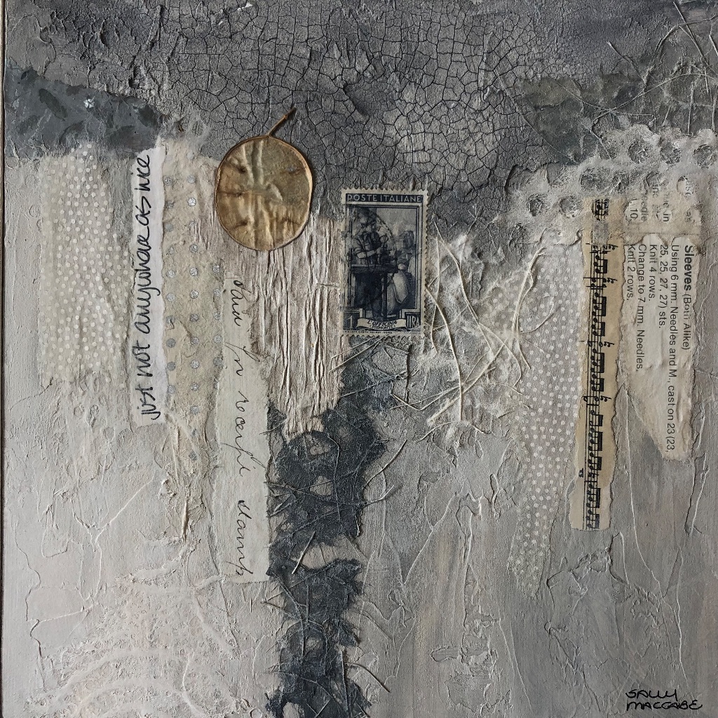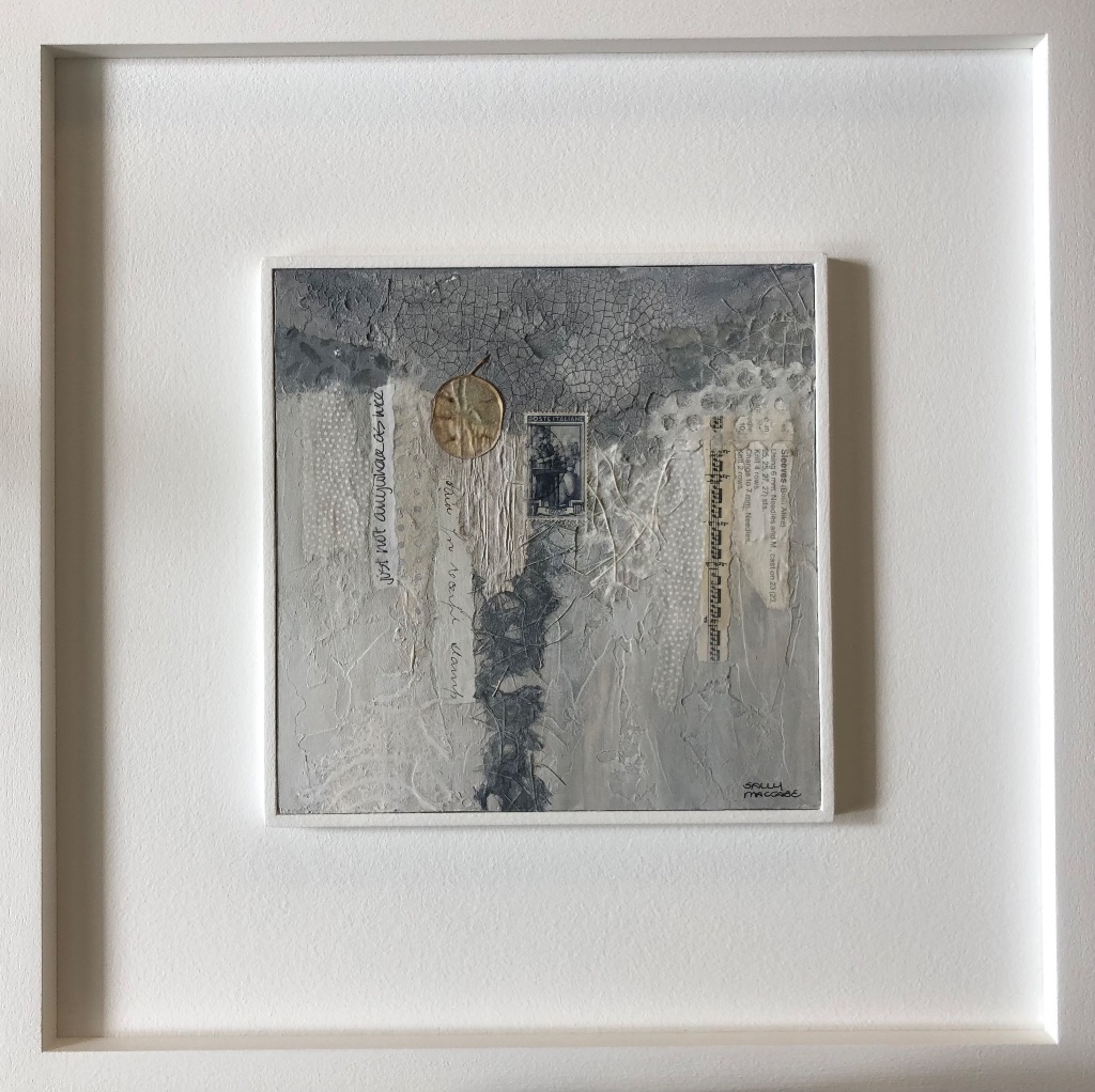 Many of my artworks are an intuitive exploration of layered textures, often using applied ephemera such as vintage letters and found objects. Some include hand stitch and fragments of fabric combined with paint that create an interesting fusion of techniques. I generally work with acrylics and use a muted palette of greys, subtle blues and neutral colours.